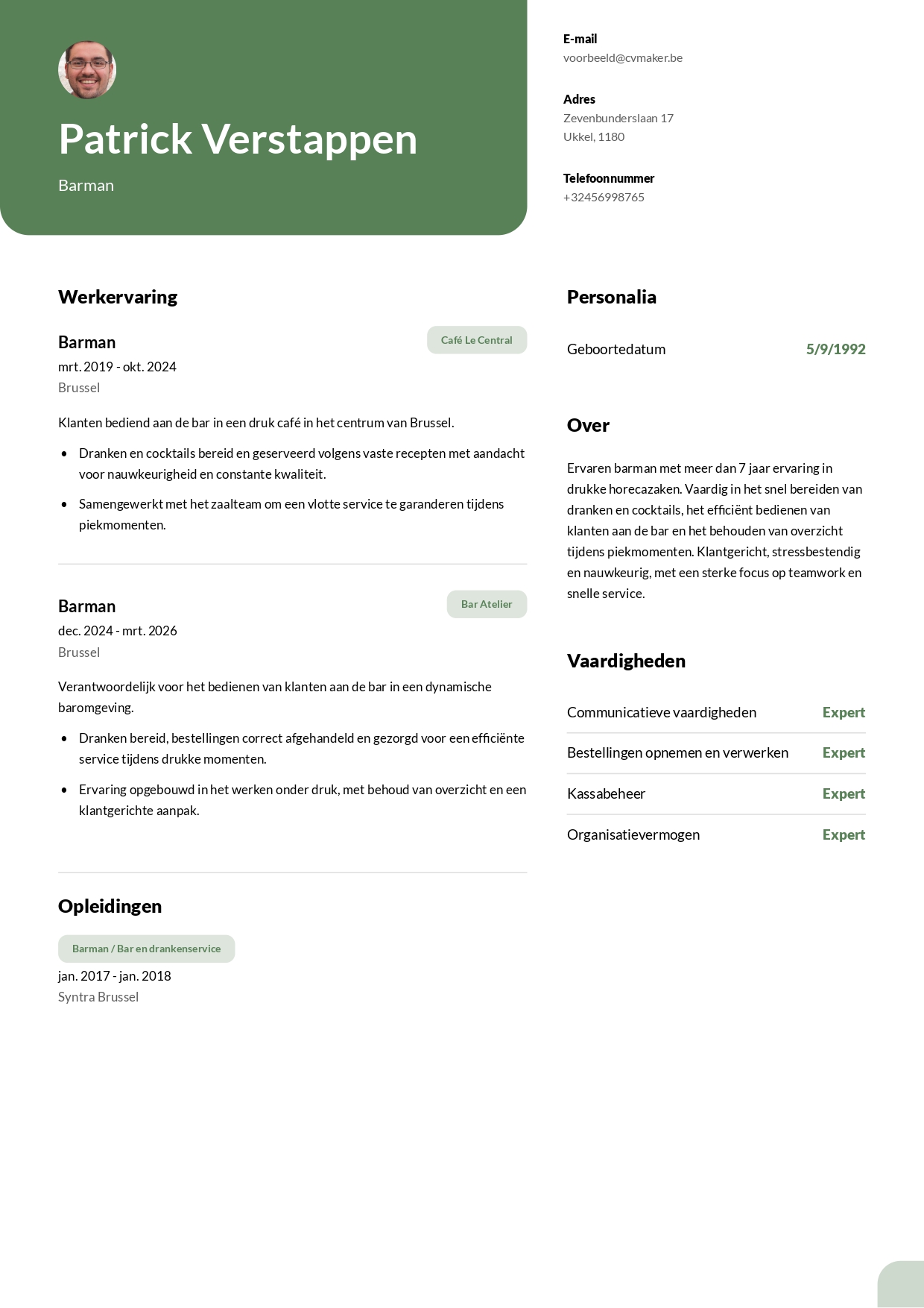 Patrick Verstappen is een barman met meer dan 7 jaar ervaring in cafés en bars. Hij koos voor het Columbia-template om zijn achtergrond op een duidelijke en gestructureerde manier te presenteren, waardoor zijn ervaring meteen helder en overzichtelijk wordt weergegeven. Patrick heeft sterke ervaring in klantgerichte service en het werken in een dynamische horecaomgeving en is op zoek naar een nieuwe functie als barman in een professionele zaak.