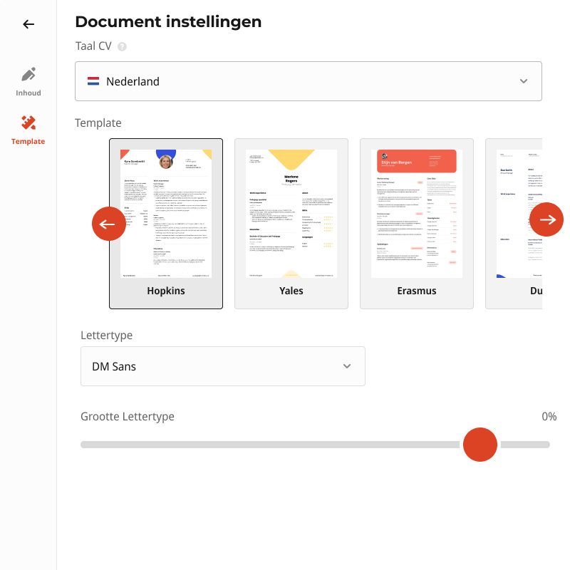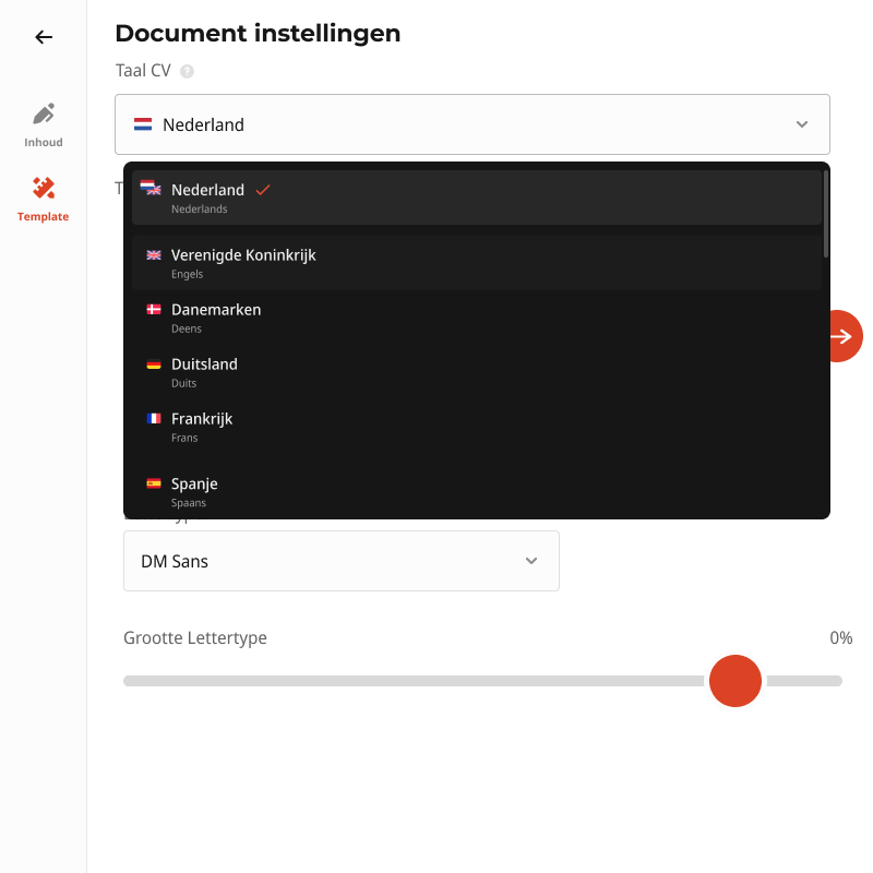 In plaats van een cv in het Engels te maken, kun je, als je al een cv hebt gemaakt met CVMaker, daar eenvoudig een Engelse vertaling van maken. In de documentinstellingen, onder 'Taal cv', kan je wisselen van de Nederlandse taal naar de gewenste taal, in dit geval Verenigd Koninkrijk - Engels. Alle kopjes en labels worden nu automatisch vertaald, alles wat je zelf hebt ingevuld moet je nog wel vertalen.